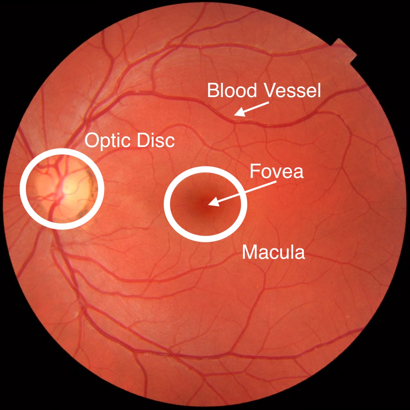 The macula / fovea is a the cone-rich segment where humans get their high visual acuity (this structure is “missing” in most other species). The optic disk is where the neurons go to send the visual information to the brain.