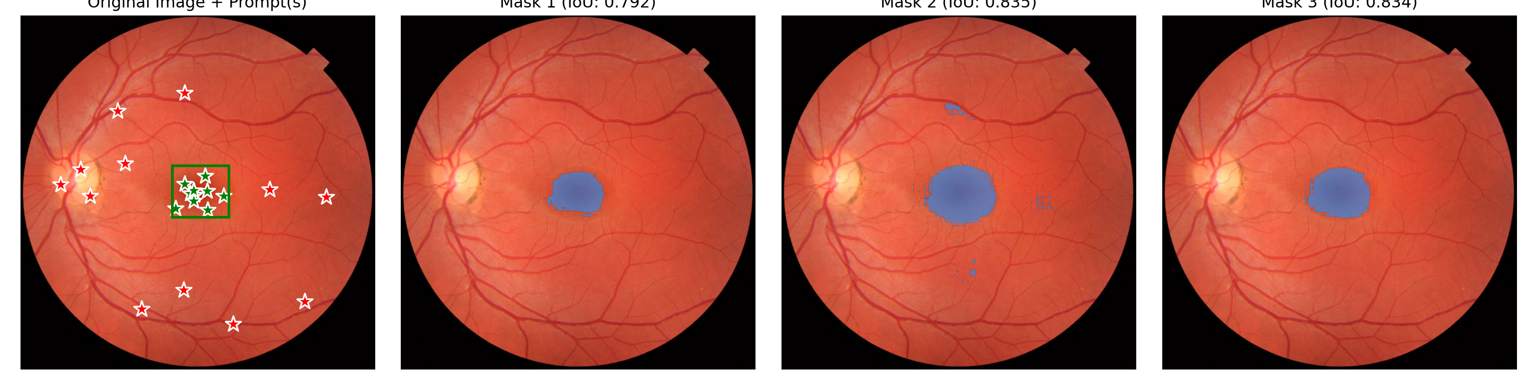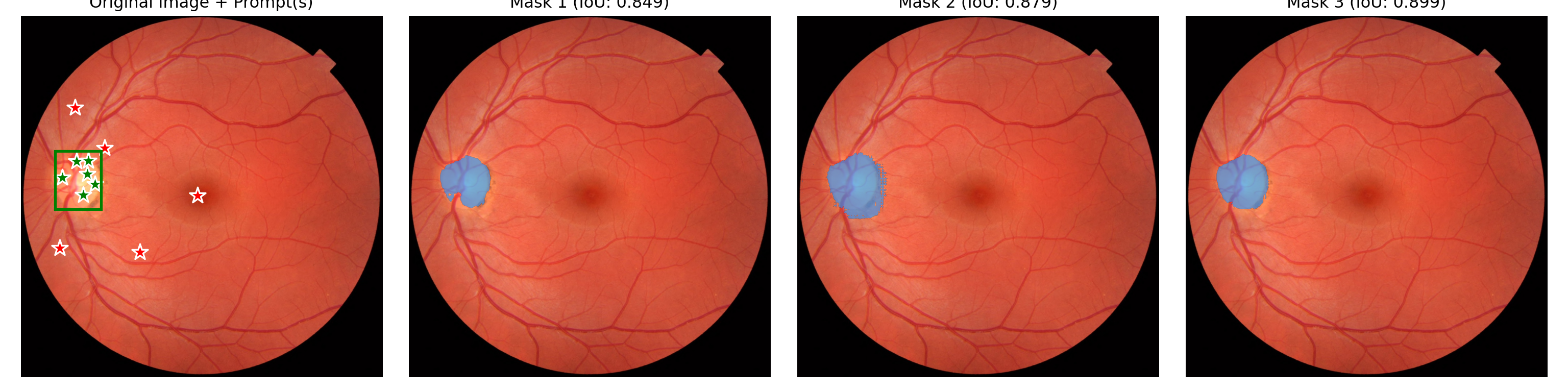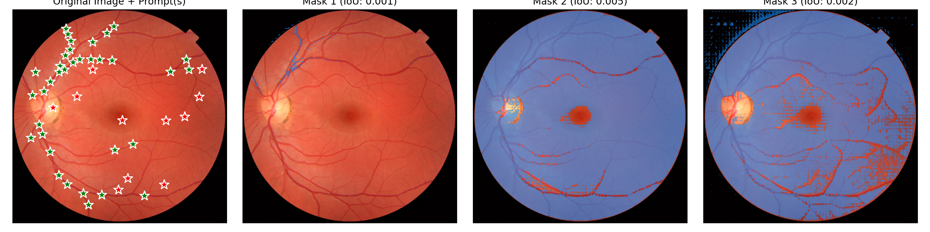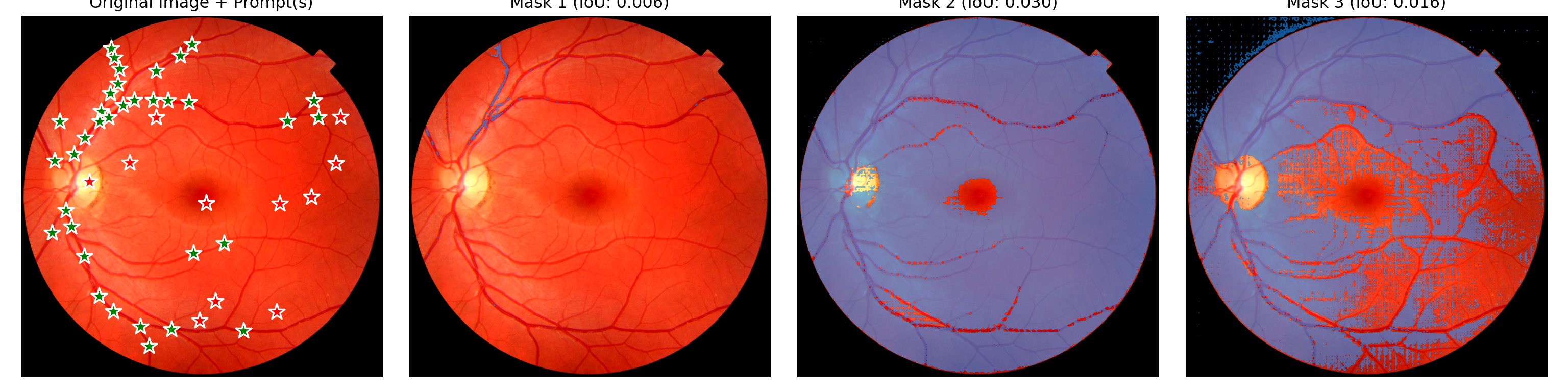 Nope, doesn’t help. A bit disappointing though not surprising as I doubt there is much vessel segmentation on fundus imaging in the training data for this model. Perhaps next I will see if I can use a LoRA approach to tune the SAM2 model….after doing a little bit of Googling with “SAM2 LoRA” I know see this paper.